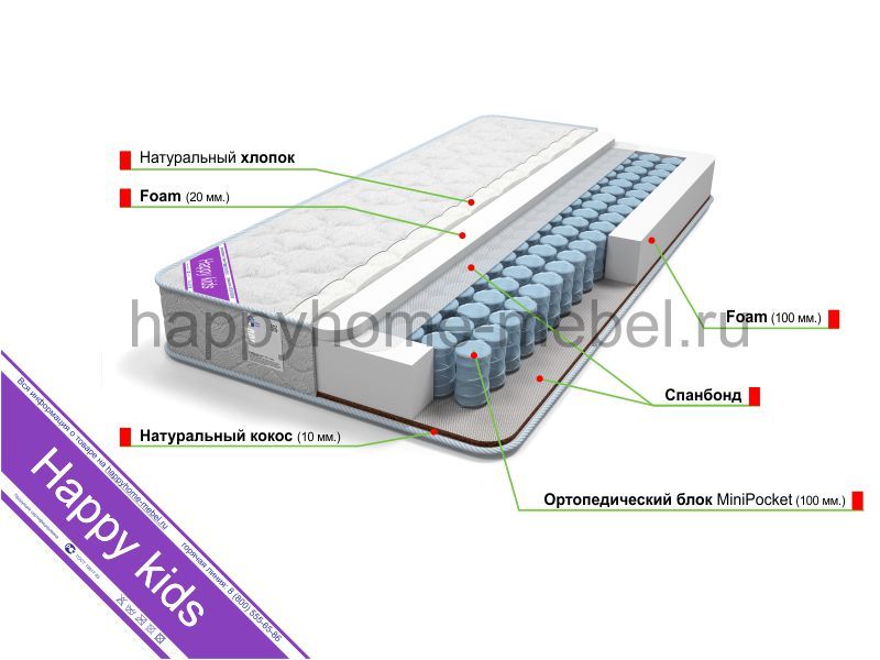 - MiniPoket - специальный анатомический блок, состоящий из 250 пружин на 1 кв. м., отдельно упакованных невысоких пружин. Пружины работают независимо одна от другой и прожимаются только в местах нагрузки, эффективно разгружая позвоночник ребенка.