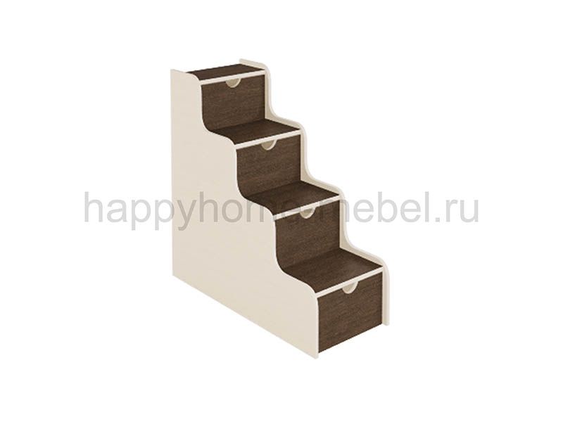 - В тумбе-лестнице располагаются три ящика, установленные на роли ковых направляющих, верхнее отделение с откидной крышкой.