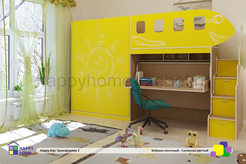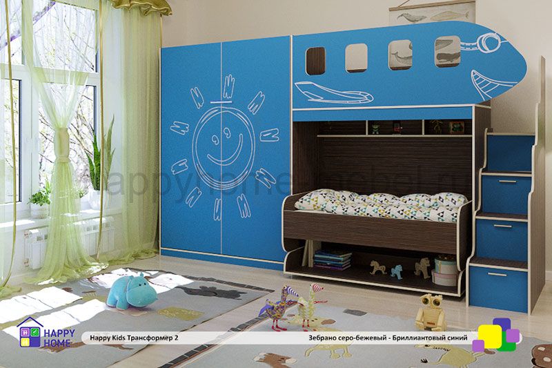 Кровать имеет полки в шкафу, а также письменный стол, превращающийся в нижнюю кровать двухъярусной кровати.