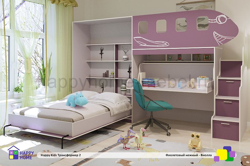 - Если у Вас в распоряжении пока только одна комната, то её можно сделать просторной, купив такую двухъярусную кровать трансформер в сочетании с откидной двуспальной кроватью для взрослых.