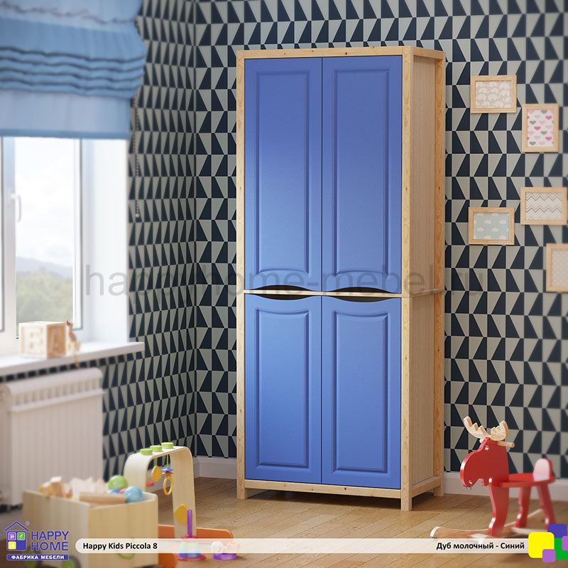 Четырехстворчатый двухсекционный шкаф Piccola 8 по дизайну сочетается с другими модулями данной серии, он предназначен для хранения постельного белья и одежды как в спальне ребенка, так и в спальне взрослых. Шкаф состоит из двух секций, расположенных друг над другом, каждая из которых имеет по две распашные дверцы. Нижняя секция иоборудована тремя поперечными полками для хранения постельного белья и вещей, а верхняя секция имеет овальную штангу для подвеса одежды на плечиках.