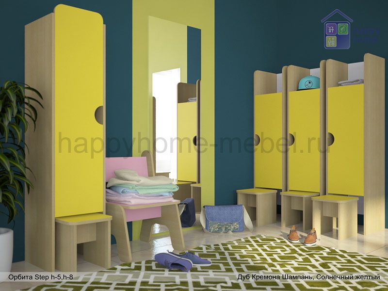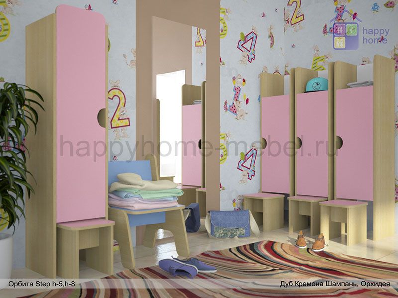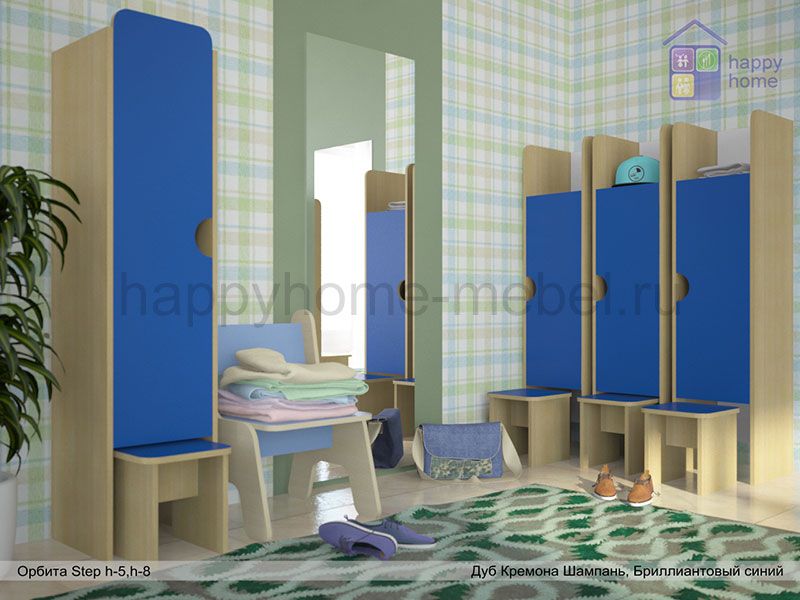 Кабинка закрытая со стулом в раздевалку для ребенка от 2-х лет производится в цветах корпуса и фасада по Вашему выбору на самом современном оборудовании из сертифицированных экологичных материалов.