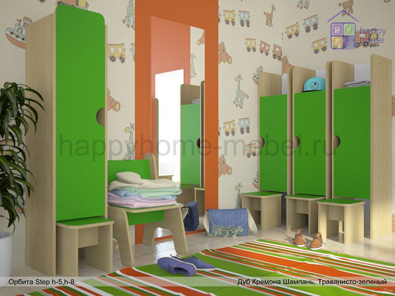 Кабинка в раздевалку напольная со стулом для ребенка от 2-х лет производится в цветах корпуса и фасада по Вашему выбору на самом современном оборудовании из сертифицированных экологичных материалов.