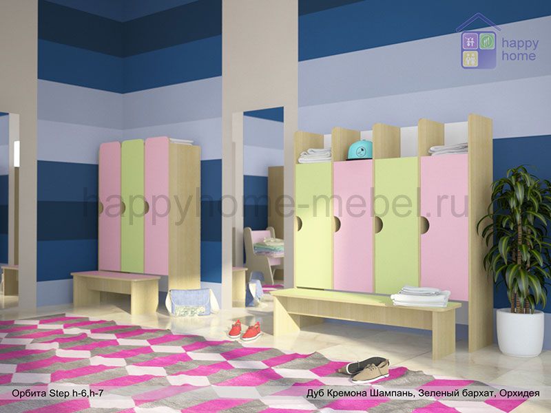 Кабинка в раздевалку напольная со скамьей для детей от 2-х лет производится в цветах корпуса и фасада по Вашему выбору на самом современном оборудовании из сертифицированных экологичных материалов.