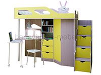 Кровать - чердак с рабочей зоной - это самый популярный детский комплекс, объединяющий в себе спальное место наверху и рабочую зону для занятий внизу. Чердак со столом для занятий может производиться в составе со шкафом, стеллажом, комодом, пеналом, тумбой и даже шкафом-купе. Кровати - чердаки с рабочей зоной разделяются на высокие, средние и низкие, а также, современные модели производятся в обратном порядке - то есть спальное место находится на низкой высоте в виде выкатной кровати на колесах, а рабочее место наверху, то есть на подиуме. Такая компоновка является самой безопасной.