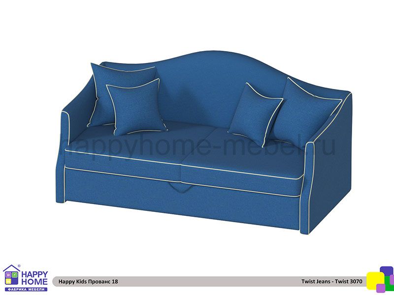 Диван кровать Happy kids Прованс 18 имеет прямую форму и механизм трансформации спального места - "Дельфин". Для обивки дивана используются ткани рогожа или микровелюр, а верхняя сторона скрытого выкатного элемента "дельфин" обита тканью-партнёром бязь. Данным типом дивана можно укомплектовать кровать-чердак с подходящей шириной ниши в результате чего легко получить три спальных места, которые могут компактно разместиться на ограниченной территории спальни или комнаты.