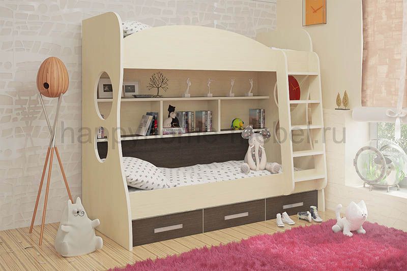 Идеальная компоновка и дизайн двухъярусной детской кровати вместе с компактной надежной лестницей, встроенным стеллажом и тремя вместительными ящиками для белья. Нижнее спальное место просторнее верхнего. Мебель бережно выполняется из 16 мм и 25 мм высококачественной плиты Эггер, Австрия на высокоточном оборудовании немецкой фирмы Holz-Her GmBH c точностью распила и посадочных мест 0,01 мм. Для соединений изделий при сборке используется только оригинальная современная немецкая фурнитура, что продлевает срок эксплуатации мебели, ее внешний вид и конструктивную целостность.