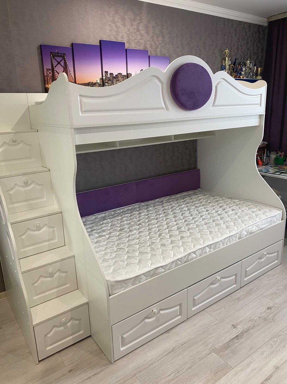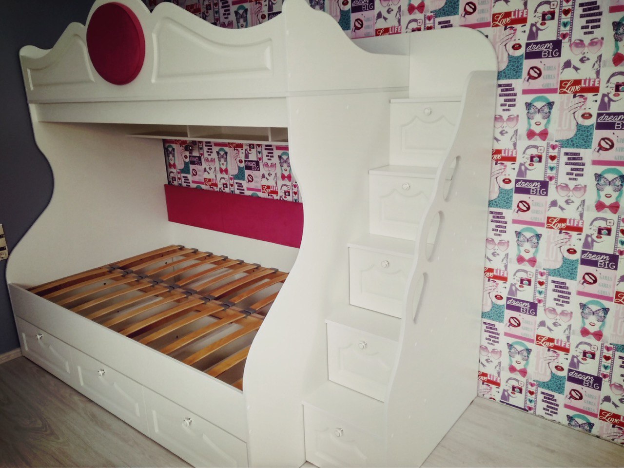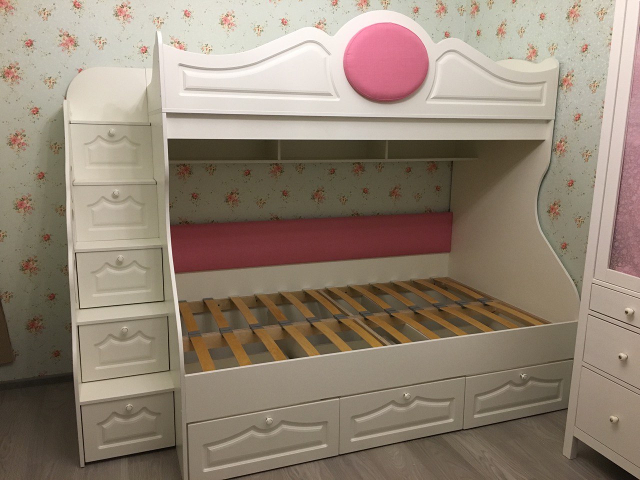 Двухъярусная кровать Happy kids Прованс 2 выполнена в классическом силе из высококачественного, экологически безопасного материала EGGER EURODECOR c сертификацией для производства детской мебели. Дизайнеры постарались реализовать принцип максимальной безопасности для ребёнка скруглив большинство острых углов. Под нижним спальным местом имеются три вместительных выдвижных ящика для хранения постельного белья или игрушек. В ступенях лестницы разместились дополнительные места для хранения вещей, вдоль стены, в нише нижнего яруса, расположен мягкий борт - данная модель удобна и функциональна для экономии свободного пространства в комнате.