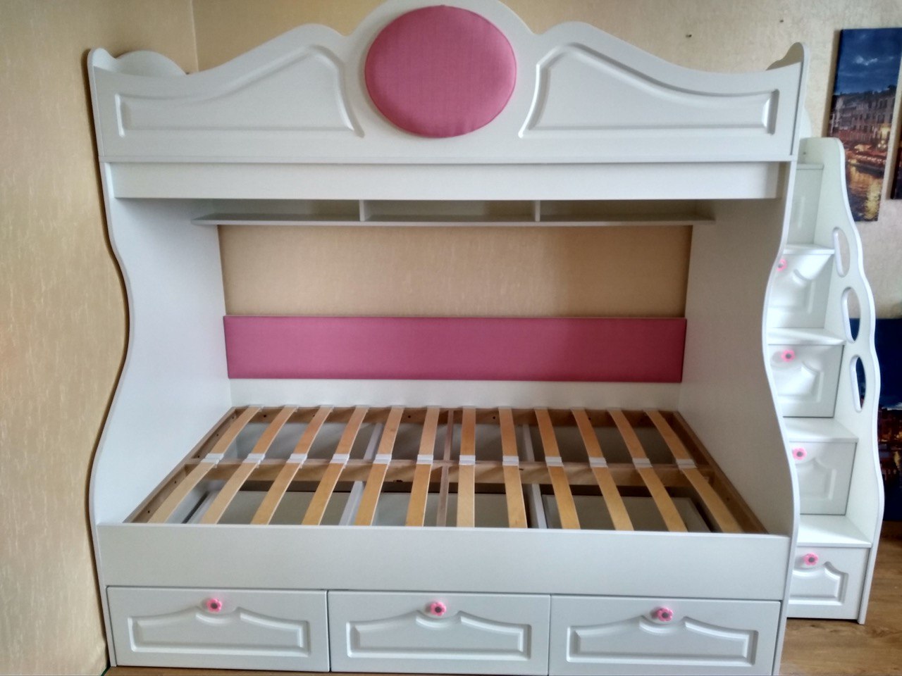 Фасад производится из высококачественного МДФ методом фрезировки. При тестировании на верхнее кроватное дно применялся груз 200 кг, а на каждую ступень лестницы 100 кг. При этом мы рекомендуем не более 80 кг (по ГОСТ 75 кг) для ежедневной нагрузки на верхний ярус только исходя из долговечности конструкции.