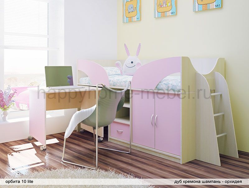 Просторная кровать-чердак, места хранения и рабочее место, которое прячется под кроватью. Воздушный и позитивный дизайн, исключительная функциональность Идеально для малогабаритных комнат.