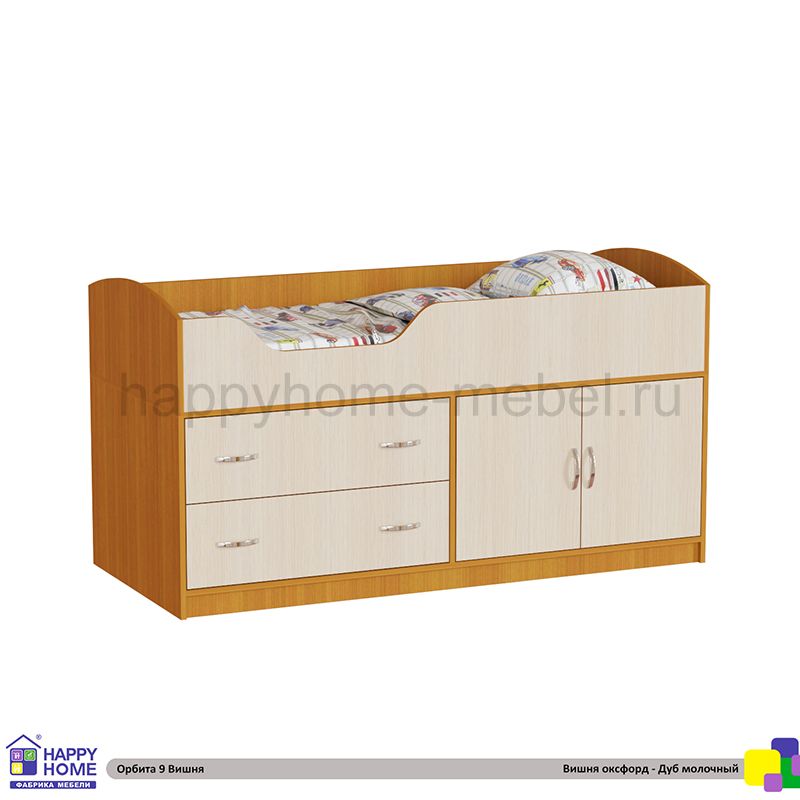 Детская невысокая кровать - чердак Орбита 9 (Корпус и кромка - Вишня Оксфорд) со спальным местом под матрас 160х70 см является самым компактным и самым вместительным решением из детских невысоких кроватей. Кровать- чердак Орбита 9 имеет два ящика для вещей и шкафчик с полкой.