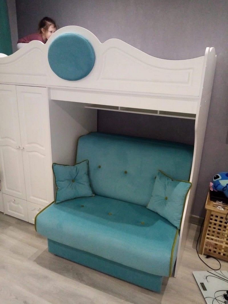 Кровать - чердак Happy Kids Прованс 4 имеет нишу 120 см. под спальным местом в которую установлен раскладной диван-аккордеон Прованс 19. Выдвинув диван - нишу легко превратить в игровую зону, а если поставить туда письменный стол, то получится удобное рабочее место. В нише может поместиться полутороспальная кровать или детская кровать - люлька.